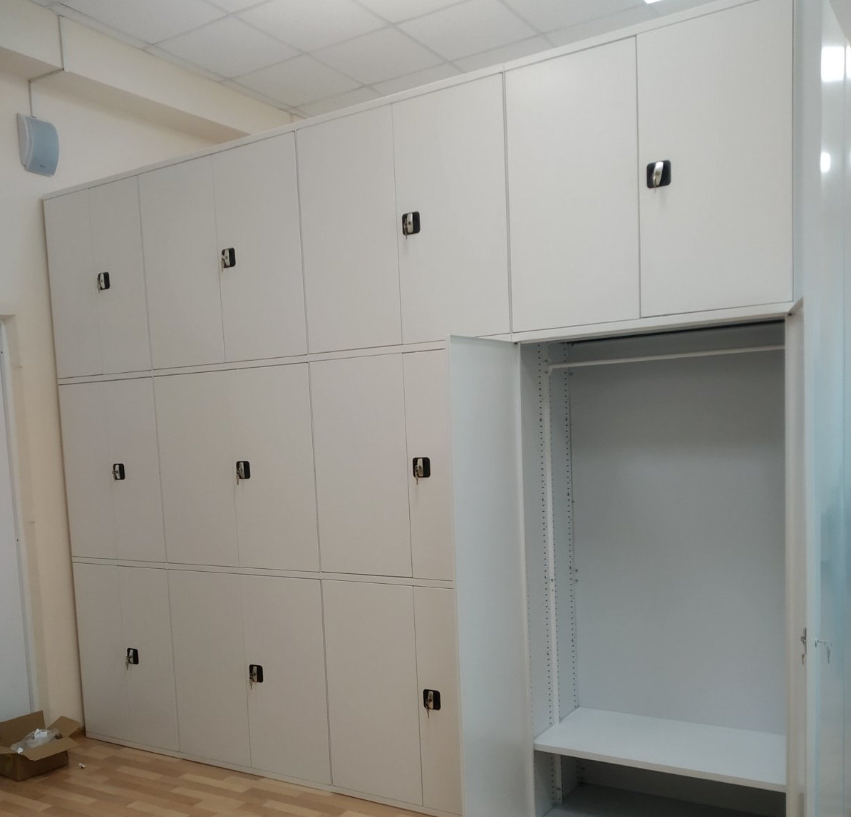 Отдельным решением являются одежные или бухгалтерские шкафы с дверцами, установленные на мобильное основание.