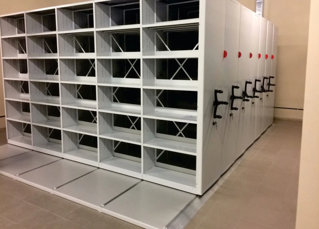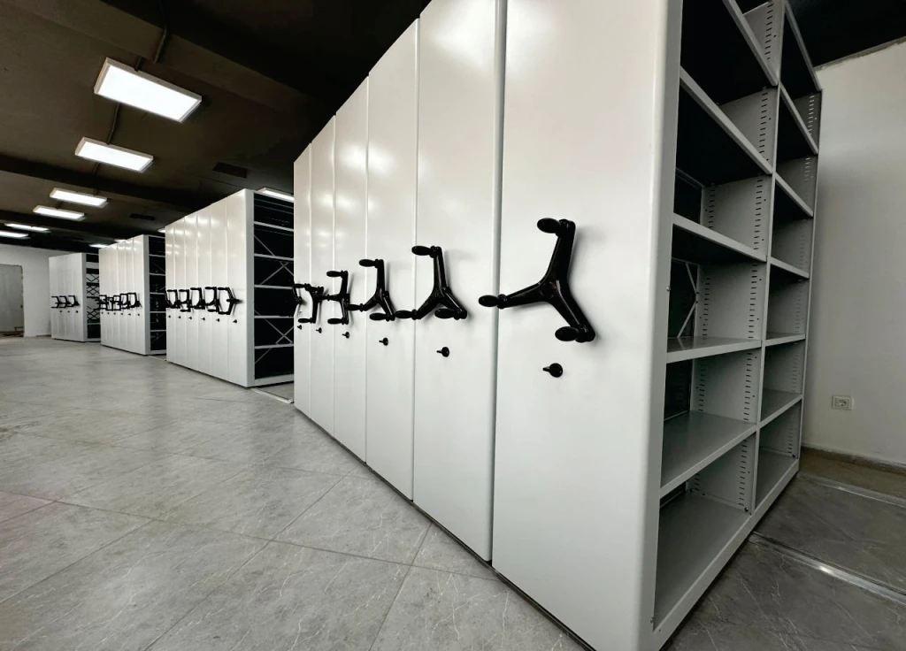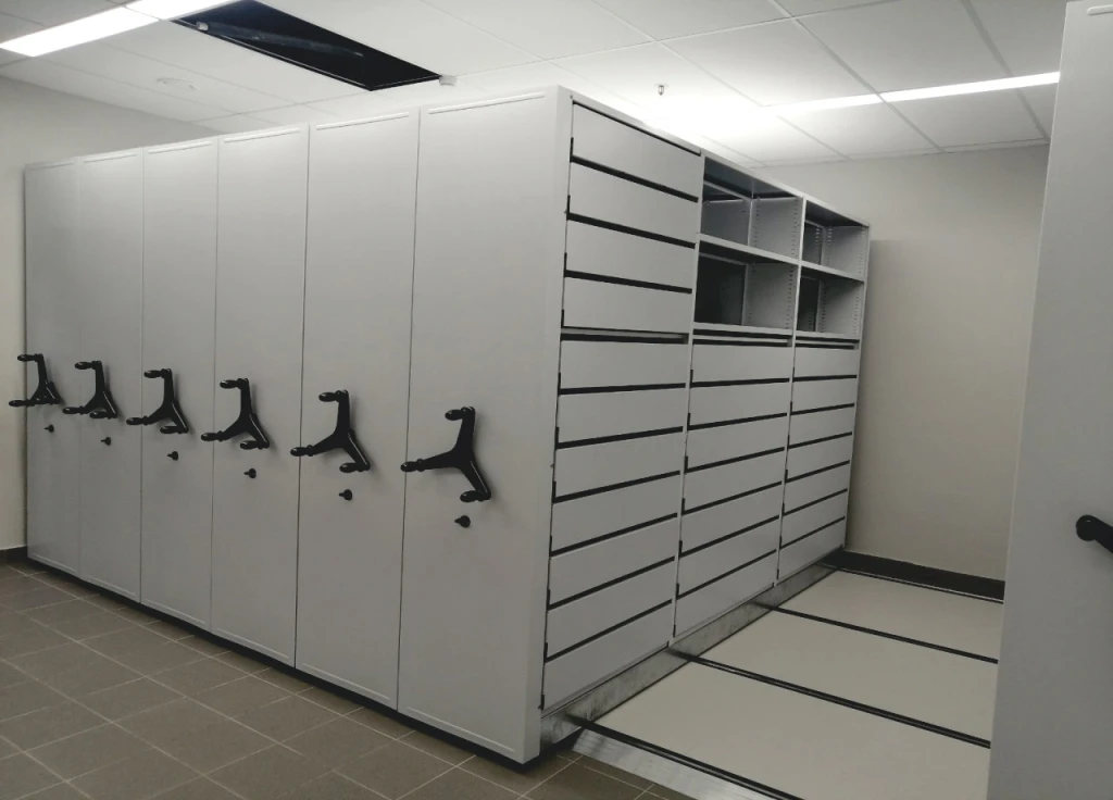 Системы компактного архивного хранения документов. Вдвое повышается вместимость или сокращаются занимаемые площади. Используются двухсторонние передвижные стеллажи для архивохранилища.